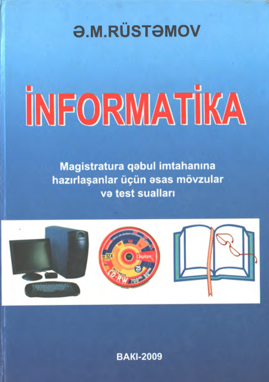 Rüstəmov, Ə.M. İnformatika [mətn]: Magistratura qəbul imtahanına hazırlaşanlar üçün əsas mövzular və test sualları. / Ə.M Rüstəmov; red. A.Q Həsənov, rəy. N.S Süleymanov. — Bakı: UniPrint, 2009. — 398 s.; 20 sm — <URL:https://azpedagogy-my.sharepoint.com/:b:/g/personal/kitabxana_adpu_edu_az/ERC9AJjOAE1ErVwTrOLmNz0BFr0ZxiBiQdTmslfpnsALSw?e=bIxfiu>.