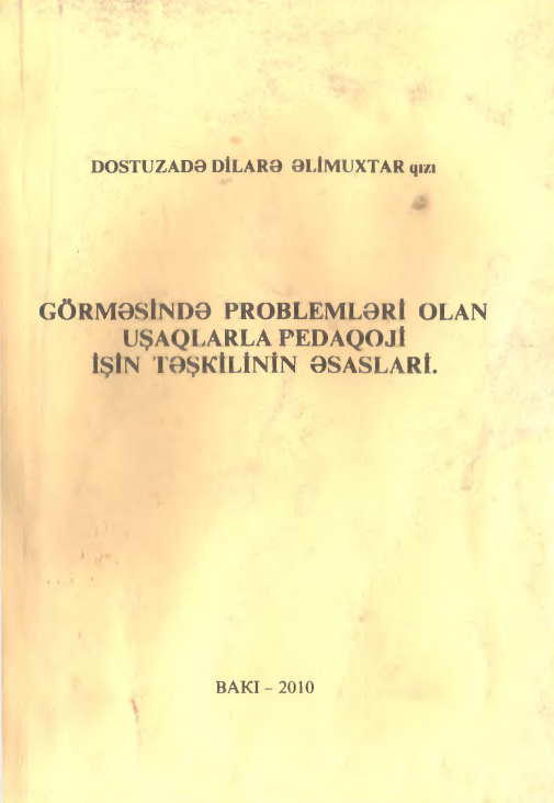 Dostuzadə, Dilarə Əlimuxtar q. Görməsində problemləri olan uşaqlarla pedaqoji işin təşkilinin əsasları. [mətn] / D. Ə. Dostuzadə; red. S. Ə. Qasımov, rəy.. L. İmanova; Azərbaycan Respublikası Təhsil Nazirliyi Təhsil Problemləri İnstitutu. — Bakı: ADPU, 2010. — 199 s.; 20 sm — <URL:https://azpedagogy-my.sharepoint.com/:b:/g/personal/kitabxana_adpu_edu_az/EdUnji6FTJlMm99R5KBU0n8BnkPd-VbuSsvEzTXp8bTd8g?e=dCppAy>. — непосредственный. Текст