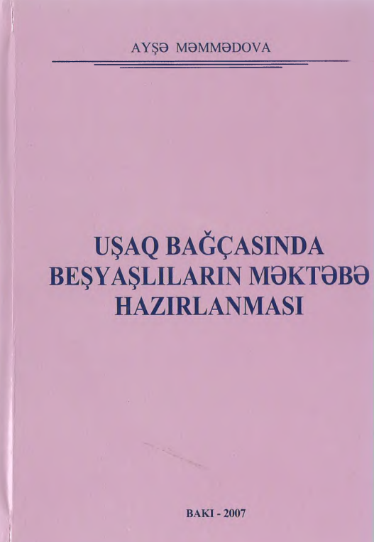 Məmmədova, Ayşə. Uşaq bağçasında beşyaşlıların məktəbə hazırlanması [mətn]: dərs vəsaiti / A. M. Məmmədova; red. Y. Ş. Kərimov; rəy.: R. Ə. Əsgərova, L. K. Cəfərova. — Bakı, 2007. — 159 s.; 21sm. — <URL:https://azpedagogy-my.sharepoint.com/:b:/g/personal/kitabxana_adpu_edu_az/EZCtTgGMTNZJh0VG438et9EBIcC7ZuCA80vXTTOvGNXfFg?e=3Nxmee>.
