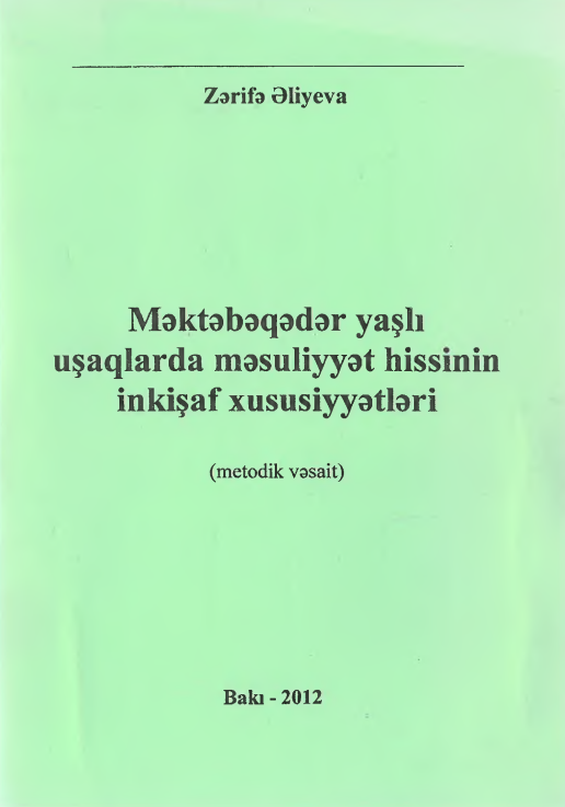 Əliyeva, Zərifə İbrahim q. Məktəbəqədər yaşlı uşaqlarda məsuliyyət hissinin inkişaf xüsusiyyətləri [mətn]: Metodik vəsait. / Z. Əliyeva; rеd. Ə. T. Baxşəliyev; rəy. R. İ. Əliyev [et al.]. — Bakı, 2012. — 35 s.; 21sm — <URL:https://azpedagogy-my.sharepoint.com/:b:/g/personal/kitabxana_adpu_edu_az/Eek4tmwtcbBDjsQPdCu1gF8BMiQJy6NwoknyzSeu2CERdA?e=dmPH26>.